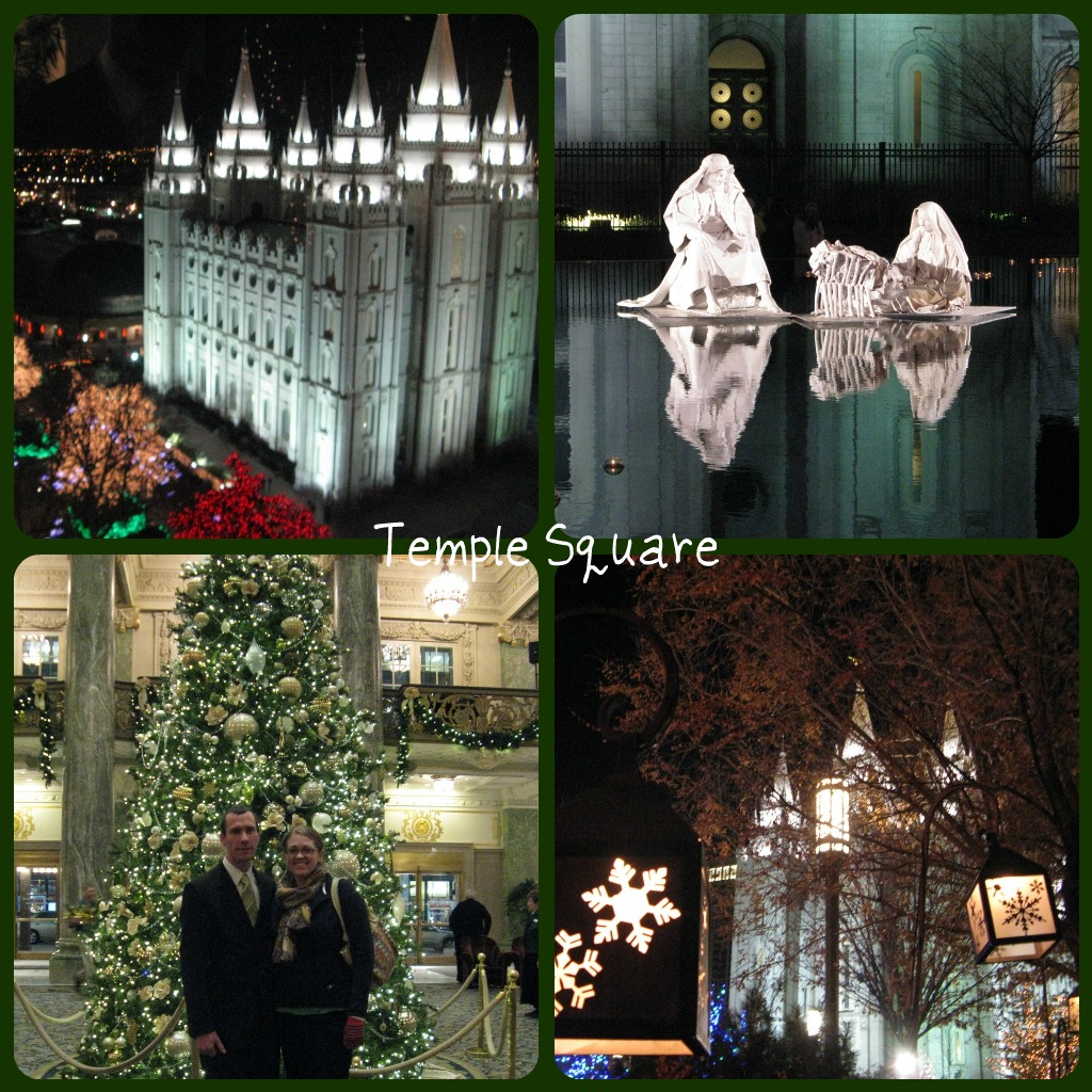 It is fun having both of our finals taken care of so that we have time during the week to do things! Last night we went to Temple Square. We walked around to see the lights before doing a session at the temple. Last year we didn't come to the lights in Salt Lake, but we did go to the lights at the Los Angeles temple, it is a fun contrast between palm trees and pine trees.